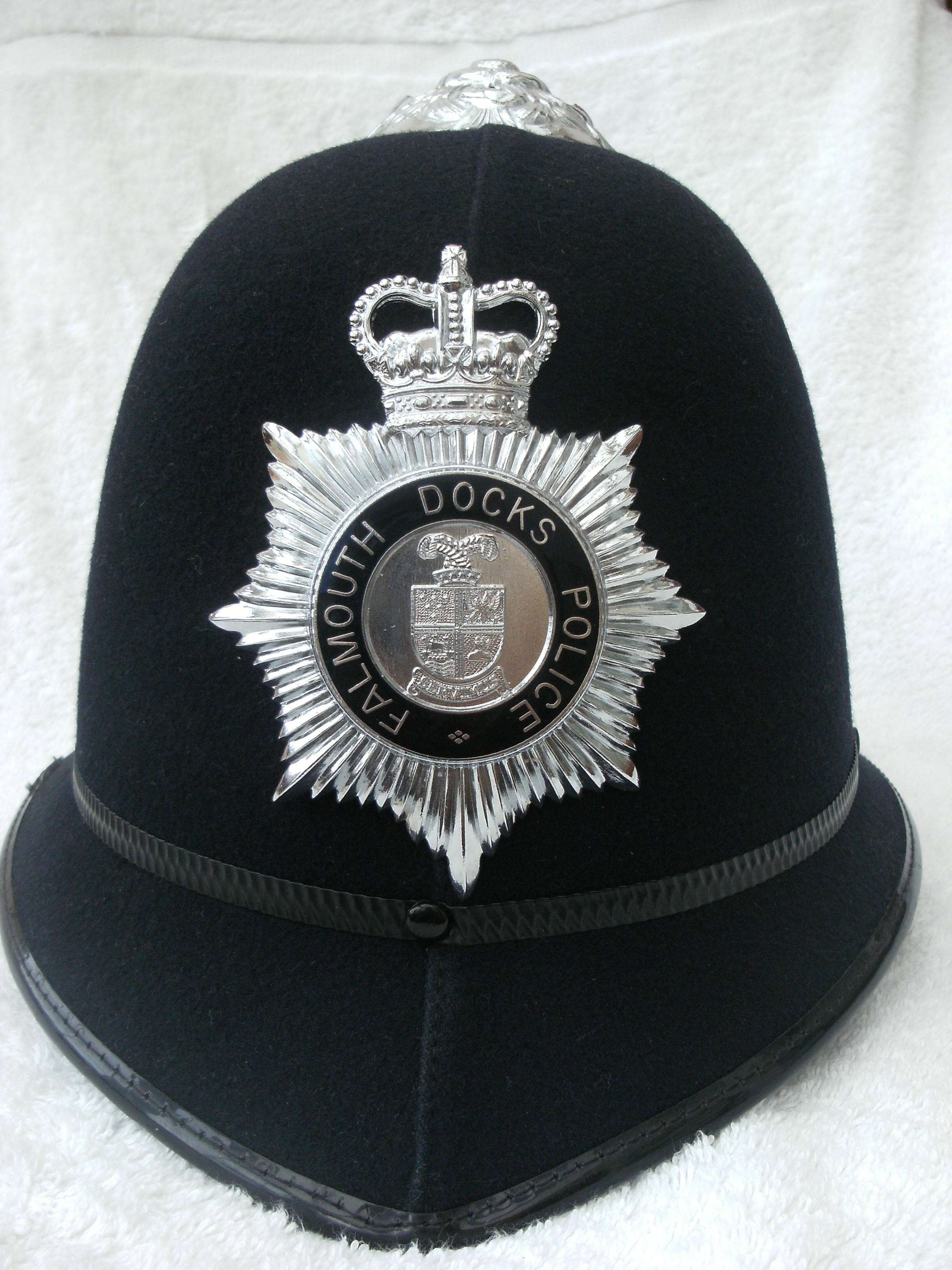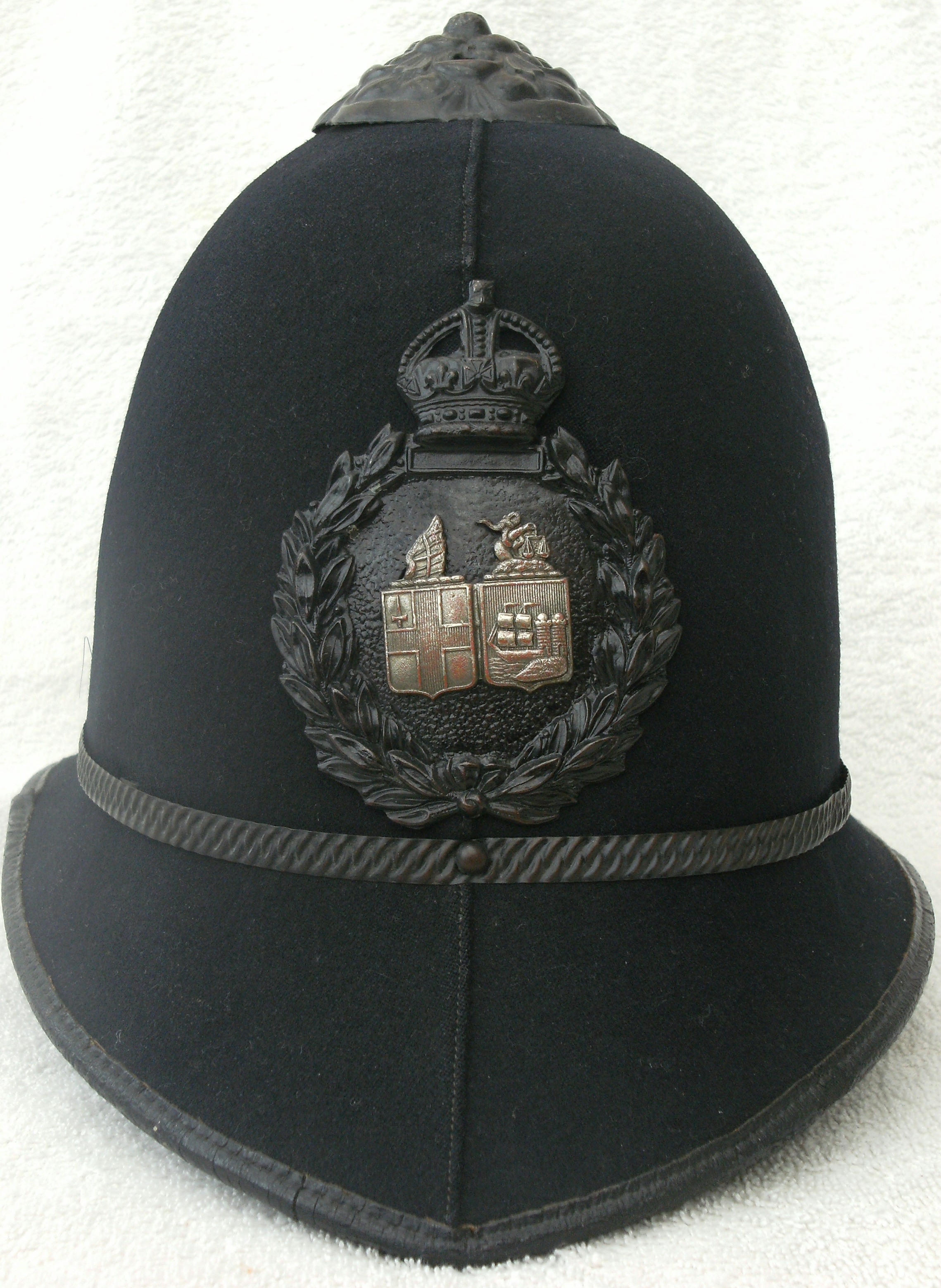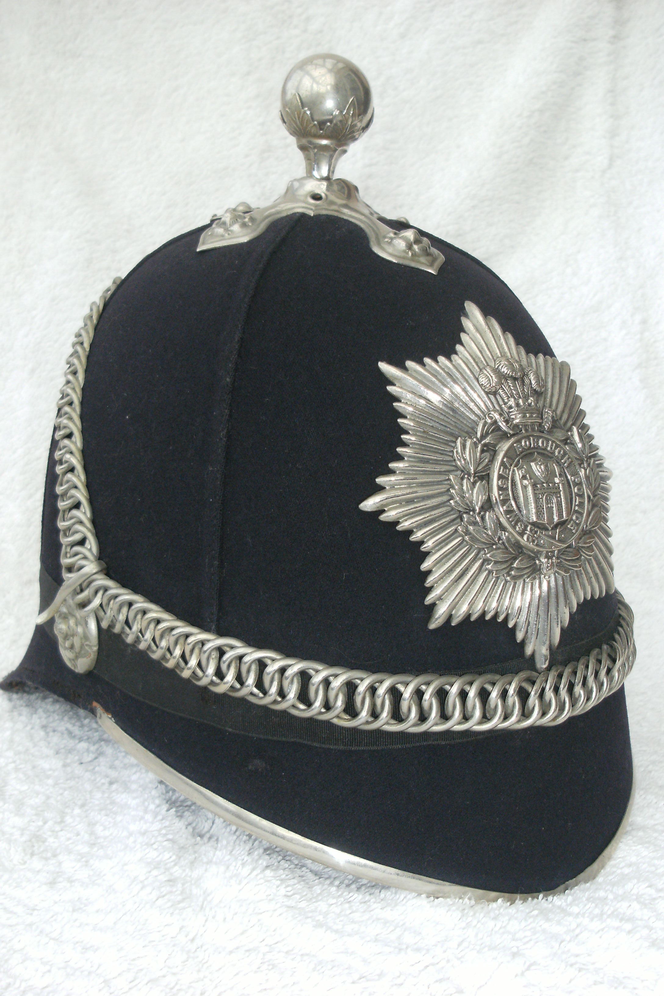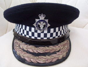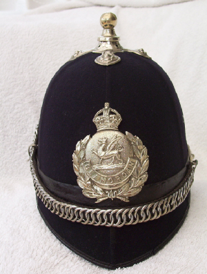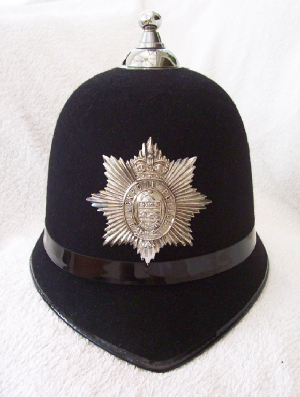 Older police helmets, Welsh police badges, belt buckles,